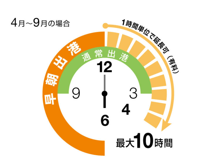 マリーナ帰港 (夏季12:00、冬季13:00) 以降は16:00まで1時間単位で延長可(別途有料)