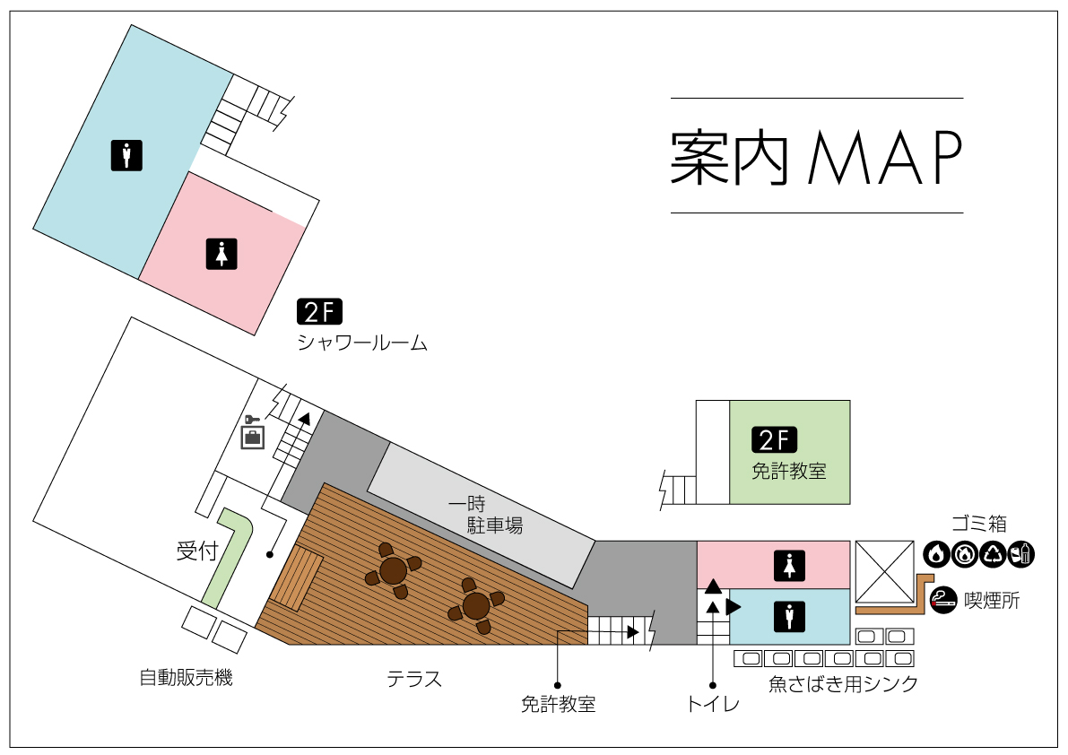リニューアルに伴い、自動販売機やゴミ箱などの場所も変わっていますので案内MAPをご覧ください。