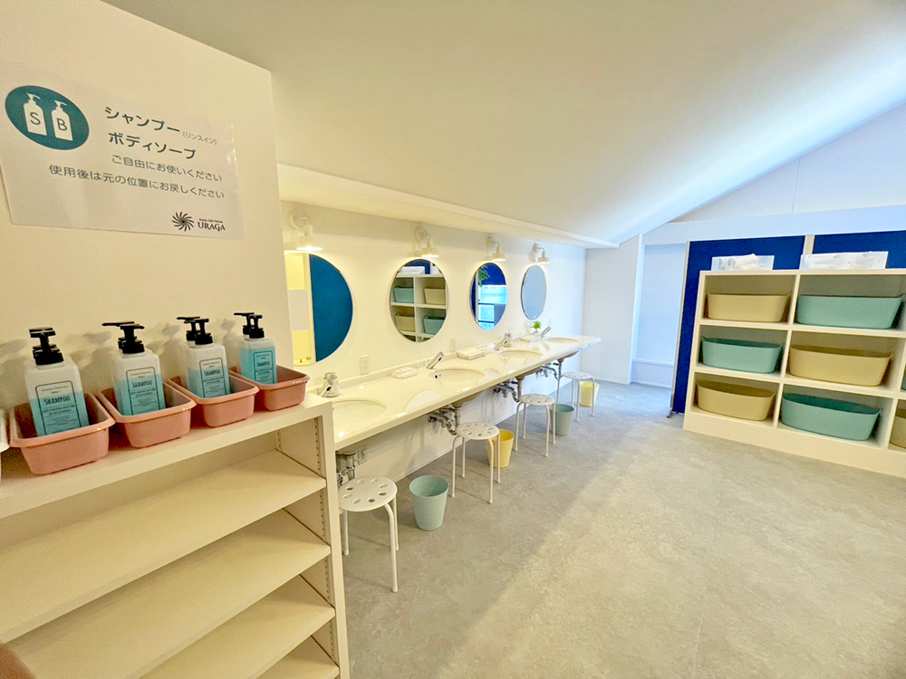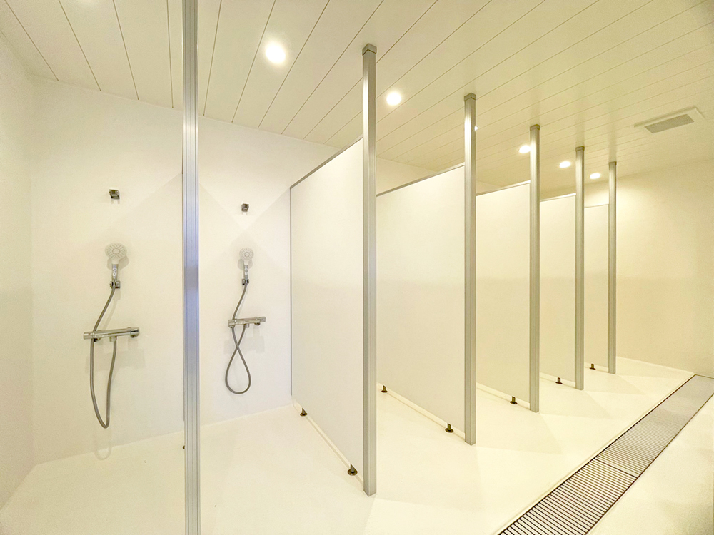 受け付け2階には、白と青を基調とした爽やかな雰囲気の無料シャワールームを新設。広々とした脱衣スペースに加えて、シャワーブースが男性用12か所、女性用8か所とゆとりある設計により、ご利用者の多いハイシーズンでもお待たせしません。ご自由にお使いいただけるシャンプー、ボディソープ、ヘアドライヤーも常備しています。