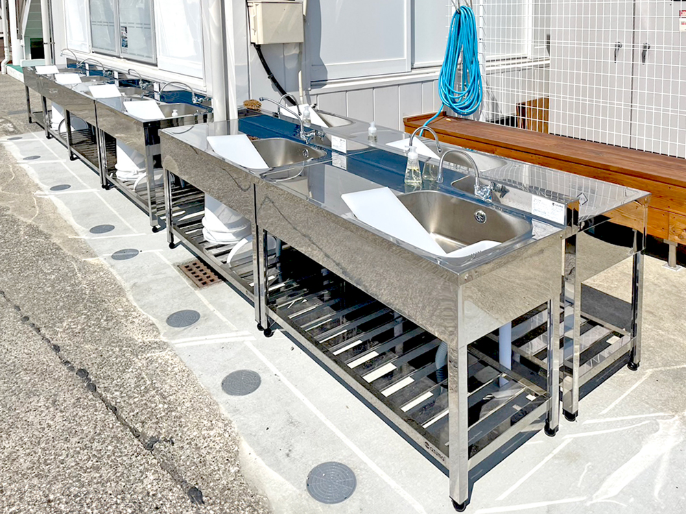 帰港ラッシュ時でもお客さまをお待たせしないようシンクを8台増設。手洗い、道具洗いにはもちろん、まな板や包丁、ウロコ取りなども常備していますので魚をさばく際にも便利です。午後の帰港の時間帯には日陰になるため、魚が傷みにくいのもうれしいポイント。