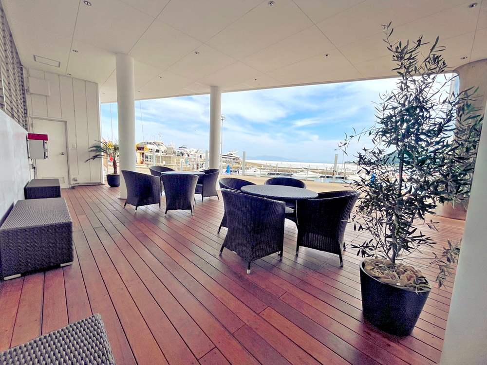 心地よい海風が吹き抜けるテラスは、ウッドを全面張り直してテーブル&チェアも新調。受け付け待ち、ランチタイム、帰港後などに、海を眺めながらスペシャルなひとときをお楽しみください。