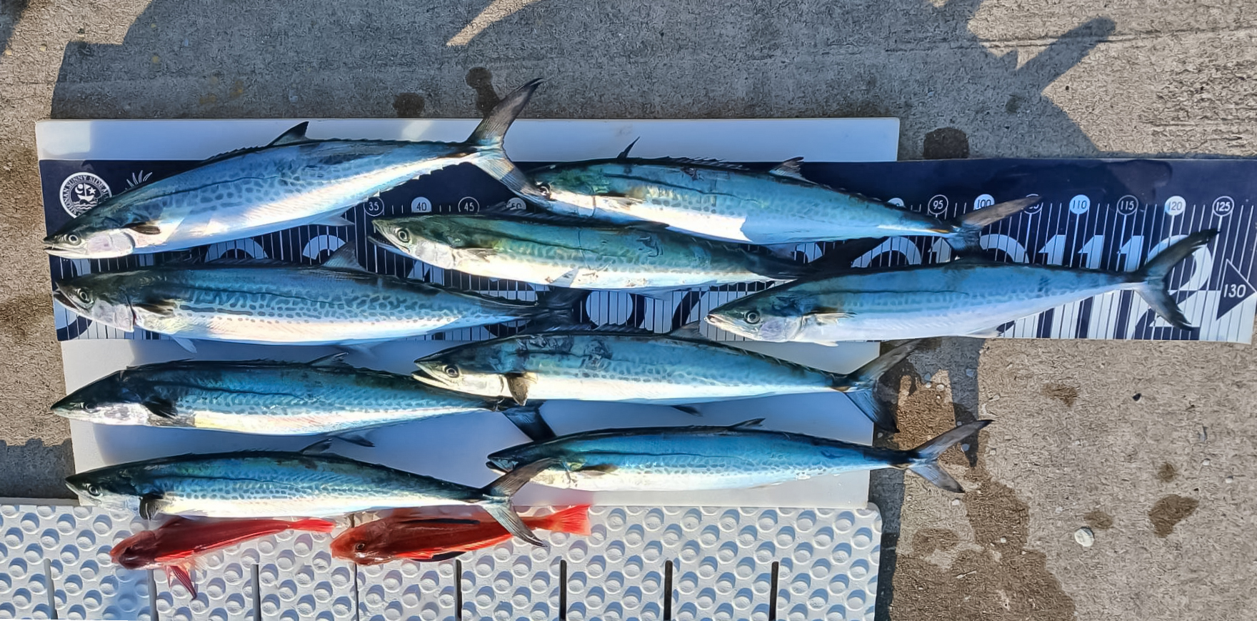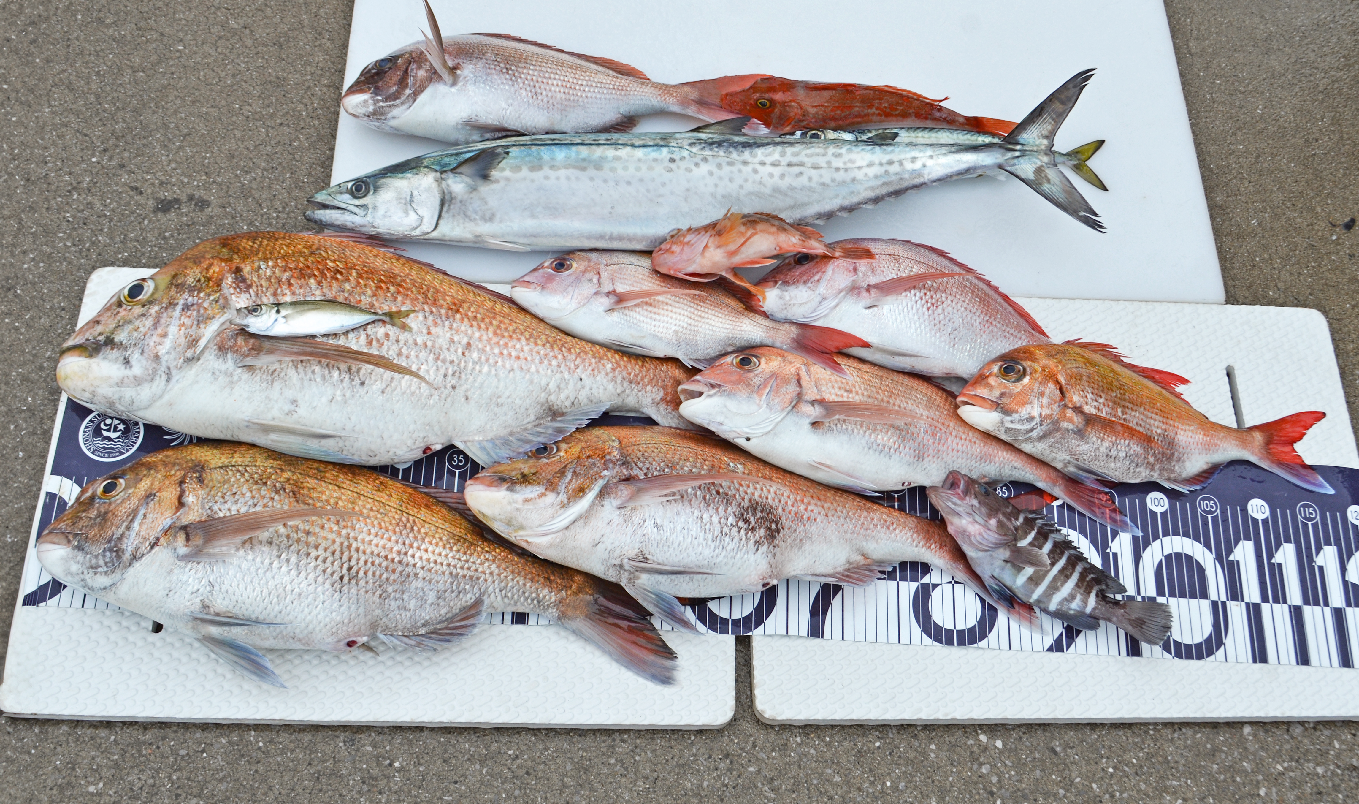 サワラは浦賀水道航路の第4ブイ北側、マダイ(小)は浦賀沖の水深40mくらいだったそう。