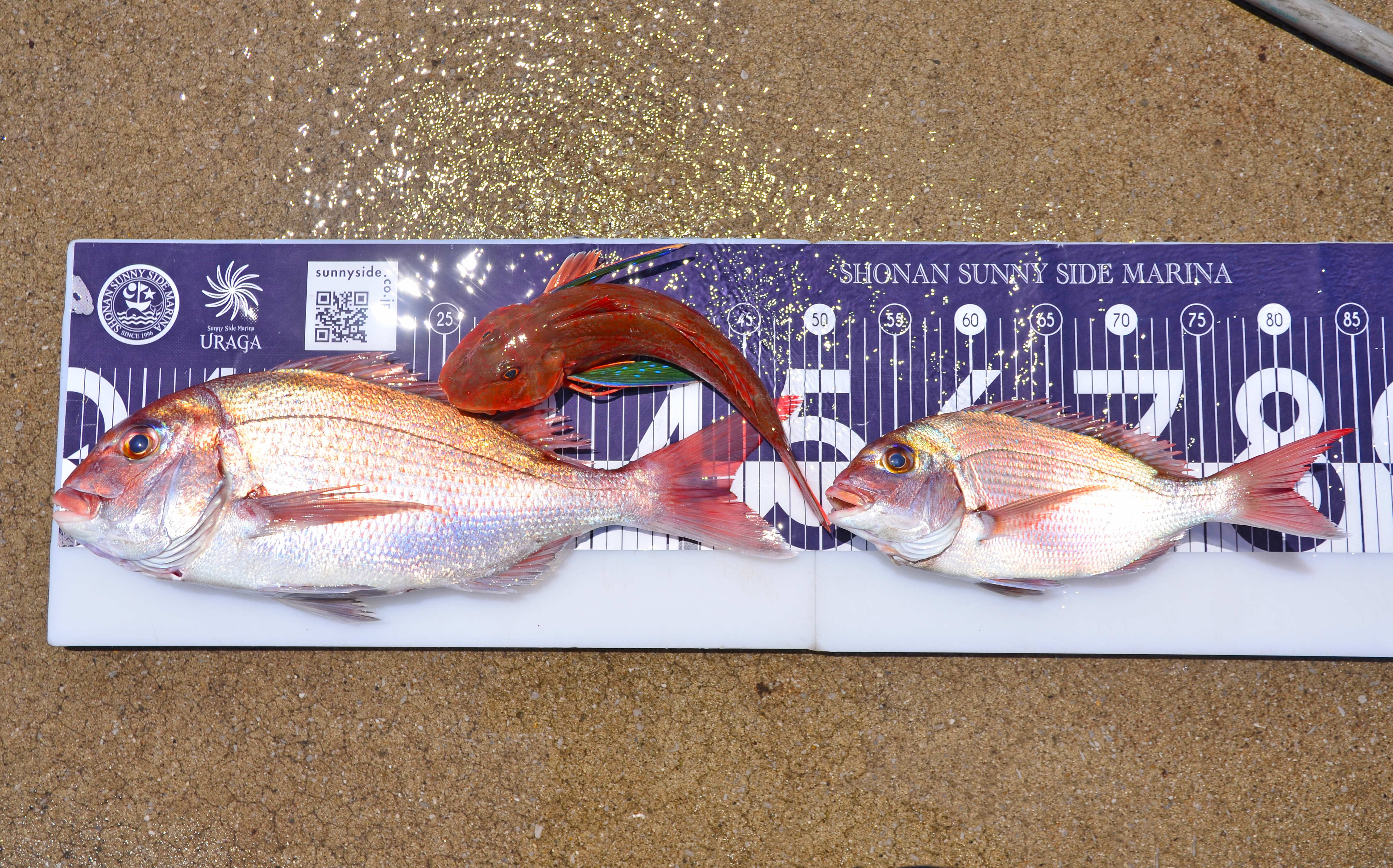 【TGビンビンスイッチ キャンディの45g~60g】で十分底はとれたそうで、狙い通り、50㎝のマダイと食べごろサイズのマダイを計2枚キャッチ!
