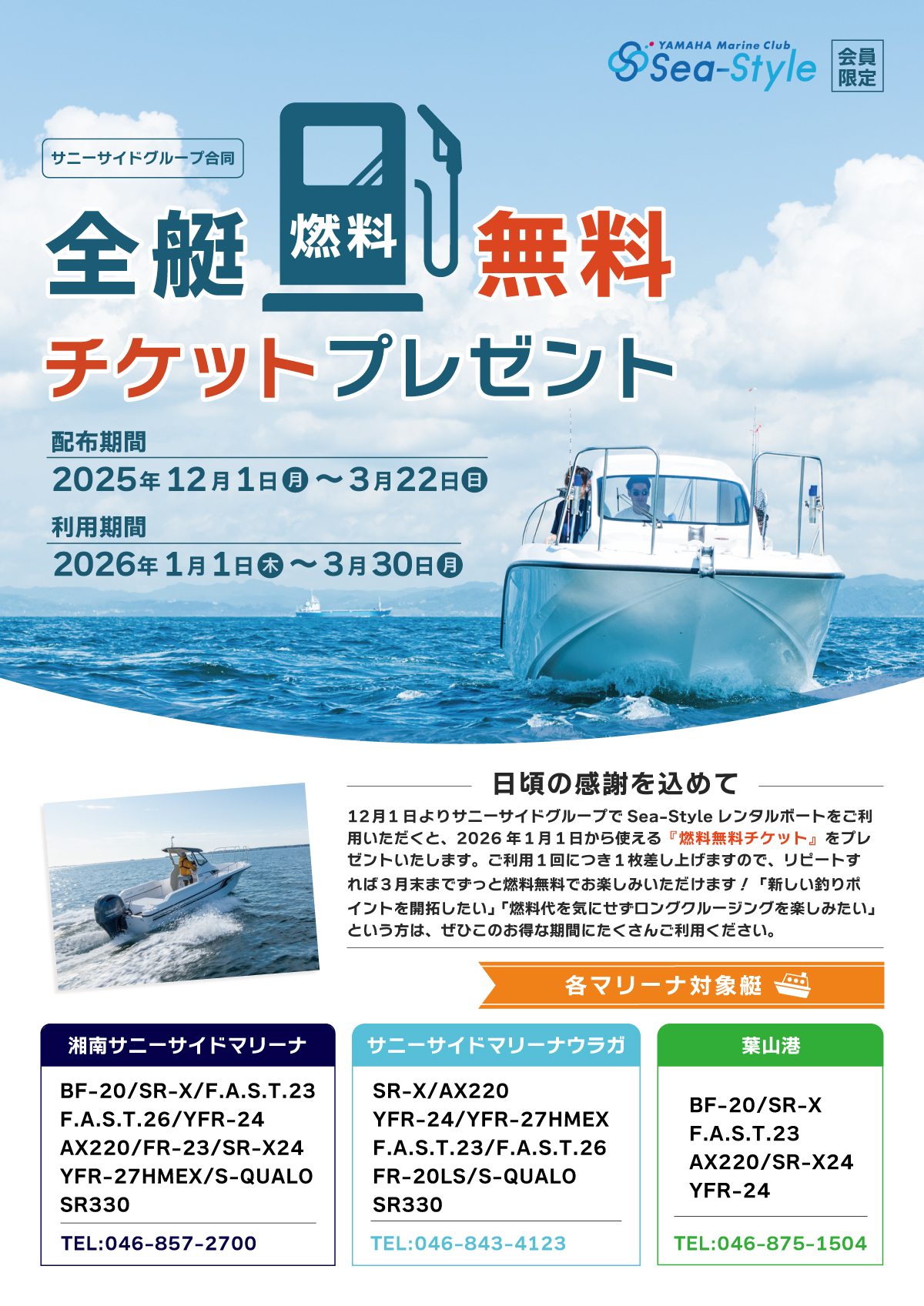 今冬も全艇燃料無料キャンペーン燃料無料チケットプレゼントを開催いたします!