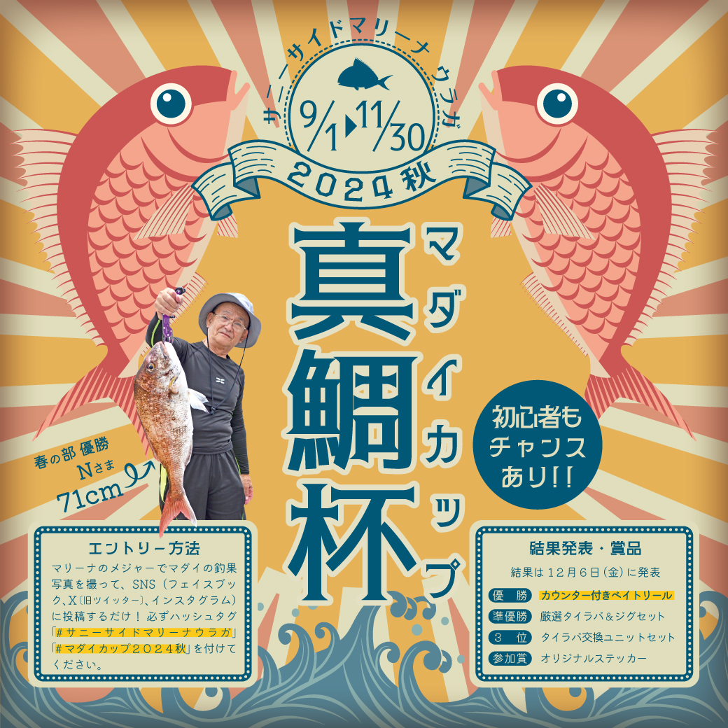 【エントリー方法】マリーナのメジャー(桟橋・受付のスタッフにお申し付けください)でマダイのサイズを計測し、お客さまご自身で釣果写真を撮ってSNS(フェイスブック、X〔旧ツイッター〕、インスタグラム)に、必ずハッシュタグ「#サニーサイドマリーナウラガ」「#マダイカップ2024秋」を付けて投稿してください(ぜひマダイを持った写真も一緒に投稿してください)。